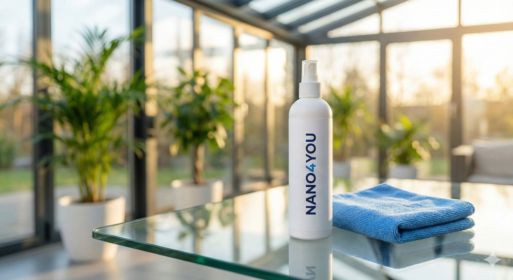 NANO4YOU Glas SR Versiegelung – weiße Sprühflasche mit Mikrofasertuch im Wintergarten